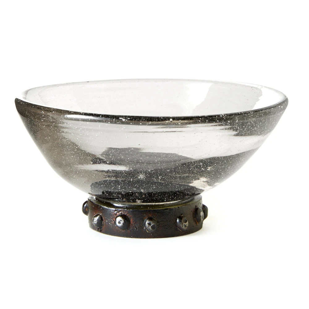 Hand-blown glass vessel on a beaded iron stand. Clear.