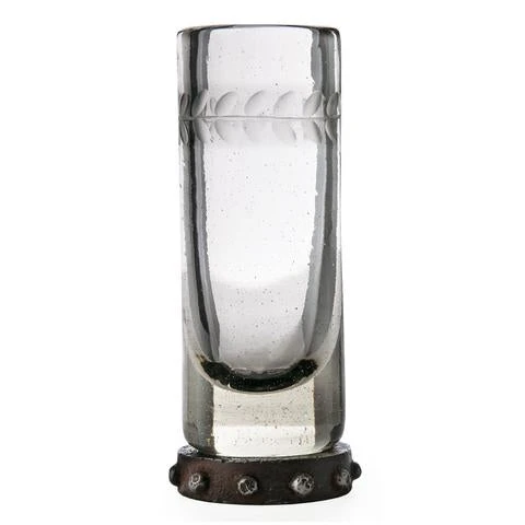 Mouth blown and laurel engraved clear triple shot glass with beaded iron stand.