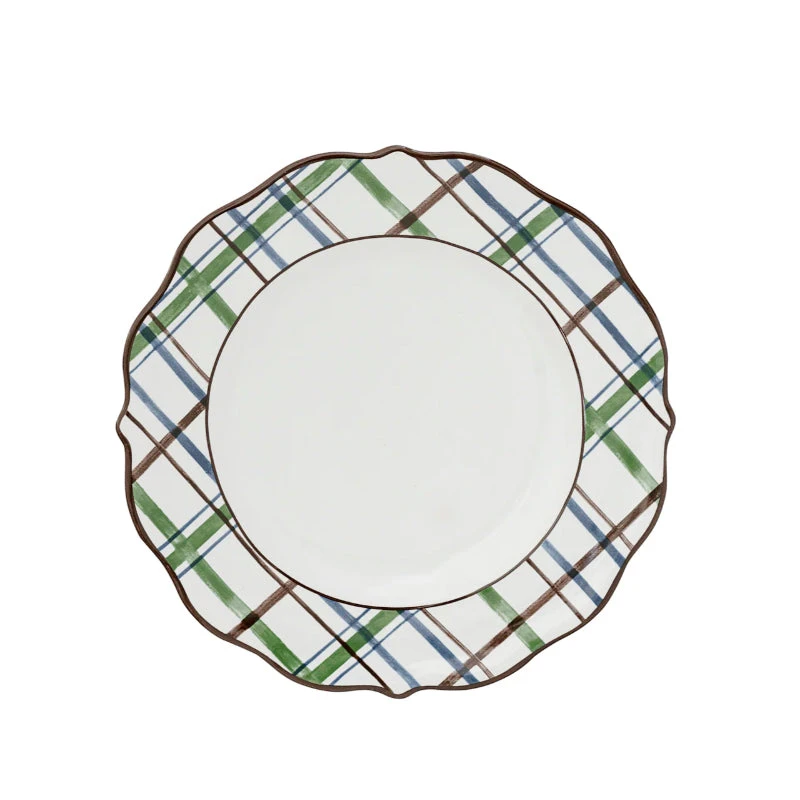 Juliska and Veronica Beard bring you a collaboration of dinnerware inspired by the colors and patterns of the Iberian coast. This dessert/salad plate features a sweetly scalloped silhouette and is banded with a Tartan plaid motif in handsome hues of brown, blue and green.
