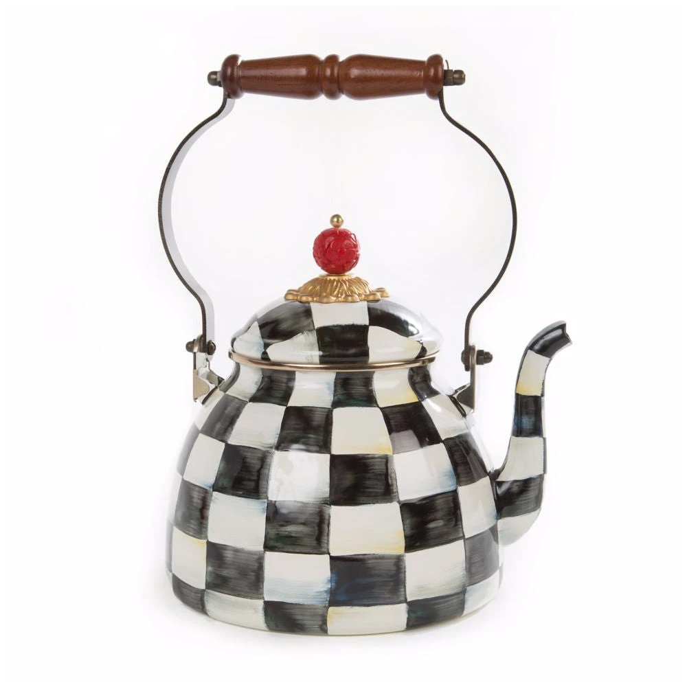Bubbling over with MacKenzie Childs style, the Courtly Check Enamel 2-Quart Tea Kettle will have you finding new reasons to put the kettle on to boil. The heavy-gauge steel underbody is hand-painted with color-dragged Courtly Checks and ceramic glaze, and rimmed in bronzed stainless steel. With a wood handle, and a lid topped with a carved faux-cinnabar bead, you may find yourself leaving this charming piece on the stovetop for kitchen beautification. Or place it on display, filled with fresh-cut flowers or greens. Our iconic MacKenzie Childs kettle makes a perfect gift for seasoned collectors, or a welcome invitation for a friend new to our Courtly Check wares.