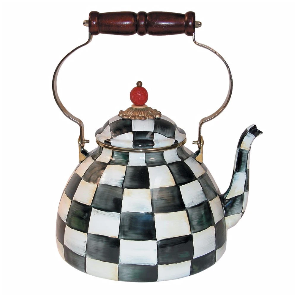 Bubbling over with MacKenzie Childs style, the Courtly Check Enamel 3-Quart Tea Kettle will have you finding new reasons to put the kettle on to boil. The heavy-gauge steel underbody is hand-painted with our color-dragged Courtly Checks and ceramic glaze, and rimmed in bronzed stainless steel. With a wood handle, and a lid topped with brass accents, bone disk, and carved faux-cinnabar bead, you may find yourself leaving this charming piece on the stovetop for kitchen beautification. Or place it on display, filled with fresh-cut flowers or greens. A perfect gift for seasoned collectors, or a welcome invitation for a friend new to our Courtly Check wares.