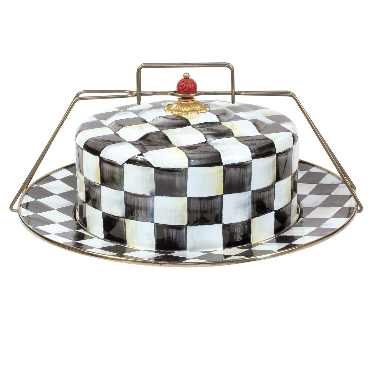 Draped from top to bottom in our color-dragged Courtly Checks, the Courtly Check Enamel Cake Carrier is sure to make an impressive entrance at your next potluck dinner. The steel underbody is hand-painted with color-dragged checks, and a carved faux-cinnabar bead crowns a brass bobeche on top. Not just for cakes—everything from cookies to hors d’oeuvres (or even a special present!) can be wrapped up, transported, and presented in the casual-but-clearly-dramatic elegance of this cake carrier.