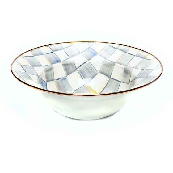 Our Sterling Check Enamel Serving Bowl is a generously sized durable bowl that’s a must-have in the kitchen. It’s decorated in our classic hand-painted Sterling Check, which features color-dragged checks in subtle shades of grey over a steel underbody.