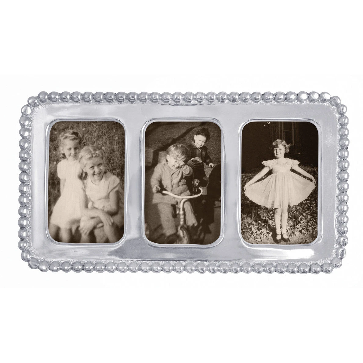 Description: Frame three of your favorite memories, perhaps from school picture day, or beyond in our Beaded Collage Frame. Part of our signature String of Pearls collection.