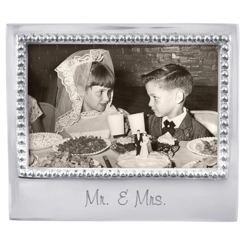 Description: Celebrate the newlyweds with this adorable “Mr. & Mrs.” Frame handcrafted from 100% recycled aluminum. Holds a 4 x 6 photo.