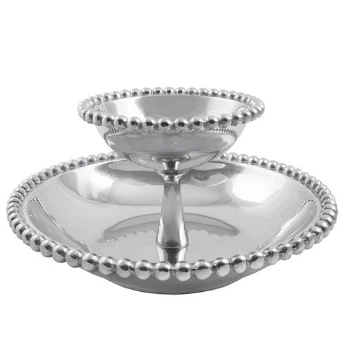 The Pearled Tiered Chip & Dip is perfect for all occasions, dress it up or down! It’s great for chips and salsa or even shrimp cocktails. Material: Recycled Sandcast Aluminum